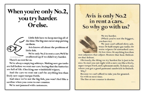 폴크스바겐에 이어서 빌 번벅과 Doyle Dane Bernbach를 유명하게 만든 캠페인이 바로 Avis렌터카의 ‘We Try Harder’ 캠페인이다. 1962년도에 작은 렌터카 업체인 Avis의 CEO 밥 타운젠트가 빌 번벅을 찾아왔다. Doyle Dane Bernbach의 독특하고 독불장군 같은 스타일에 끌려서 Avis 렌터카의 광고를 의뢰하게 되었던 것이다. 빌 번벅은 조건을 달고 광고 대행을 받아들였다. “OK, we’ll take it. But you must do exactly what we recommend.” 당시 미국의 렌터카 업계는 ‘허츠’라는 선발 업체가 시장의 35% 이상을 점유하고 있었고 Avis는 크게 차이나는 2등이었다. 그것도 3위와 별로 차이가 안나는 2등. Doyle Dane Bernbach 팀은 솔직하고 진실한 마음으로 소비자에게 접근하는 광고를 만들기로 밥 타운젠트와 합의했다. 그리고 광고에서는 이전에 찾아볼 수 없었던 ‘넘버2 선언’을 만들어낸 것이다. ‘우리는 단지 2등일 뿐입니다. (We’re only #2) 그래서 우리는 더 열심히 합니다. (We Try Harder)라는 솔직한 고백이 나왔던 것이다. 고객이 차를 반납하면 깨끗이 청소하고 재떨이도 비우고 예약 상담도 좀 더 친절하게 하는 등 2등이라서 1등을 따라가고자 더 열심히 할 수밖에 없다는 이야기다. 그런데 이 광고를 내보내려면 Avis의 모든 직원들이 이 내용을 잘 이해하고 실행해야 한다. 아니면 거짓광고가 되는 것이다. 밥 타운젠트가 Doyle Dane Bernbach의 이 광고를 처음 받아 보았을 때 그것은 그가 요청한 것을 훨씬 뛰어 넘는 것이었다. 하지만 그는 그것을 받아들이고 이 전설적인 ‘We Try Harder’ 캠페인이 진행이 되었던 것이다. 그리고 밥 타운젠트는 광고가 광고로 그치지 않도록 미국 전역의 지점을 찾아 다니며 직원 한 사람, 한 사람과 대화를 나누었다. 소비자에게 더 나은 서비스를 제공해야 한다고 강조했다. (마케팅에서 정말 중요한 포인트다. 광고에서의 메시지대로 내부 직원들이 움직여 주어야 한다.) 하룻밤 사이에 사람들은 이 광고를 보고, 이야기하고 찾게 되었다. 놀라운 반응이었다. 사실 Doyle Dane Bernbach는 광고를 밥 타운젠트에게 보여주기 전에 사전 소비자 조사를 했다. 절반 정도는 이 광고를 싫어했고 나머지 절반 정도는 이 광고를 좋아했다. 빌 번벅은 “절반이면 됐네. 우리는 그 절반을 원하지!” “그대로 밀고 나가자.” 하였다. 이 캠페인이 시작되고 2개월 만에 경영은 흑자로 전환되었고 뉴욕에서는 1개월에 매출이 51%나 증가했다. 캠페인 전개 2년 만에 전국적으로 35%의 경이적인 신장을 이루었다. 하지만 Avis 와 Doyle Dane Bernbach는 많은 이슈에 있어서 서로 의견 일치에 실패했다. 밥 타운젠트가 회사를 떠나고 경영자가 몇 차례 바뀌었다. 그 사이, Doyle Dane Bernbach는 잘렸다가 다시 고용되고 다시 잘리는 일을 당했다. 하지만 수 십 년이 지난 지금도 세상 어디에나 Avis 렌터카가 있는 곳에서는 “We Try Harder”라는 슬로건을 쉽게 찾아볼 수 있다. ‘대행사가 바뀌어도 명작은 살아 남는다. 그게 세상 돌아가는 이치인가 보다.’ Doyle Dane Bernbach의 카피라이터였던 밥 레벤슨의 말이다.